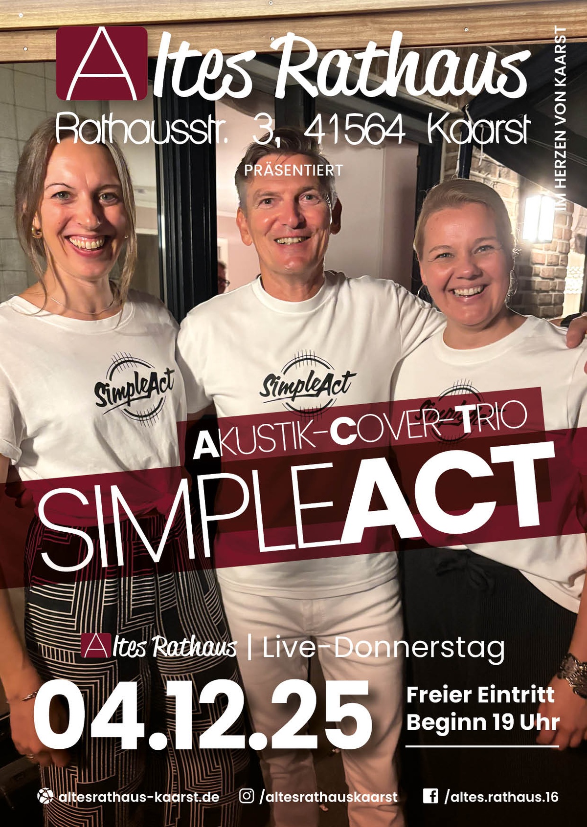 🎶 Live-Musik im Alten Rathaus Kaarst! 🎶 Am Donnerstag, 04. Dezember ist es wieder soweit: Das Acoustic-Cover-Trio SIMPLE ACT steht bei uns auf der Bühne und bringt die besten Hits in ganz eigener Interpretation mit. Freut euch auf ehrliche, handgemachte Musik, viel Leidenschaft und eine Atmosphäre, die man einfach erlebt haben […]